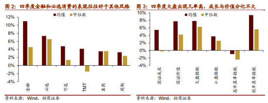 金融与必选消费往往表现好于其他风格。过往15年的四季度中,金融风格表现占优共出现7次,接近50%,必选消费占优出现5次,占1/3。从整体四季度收益率的均值来看,金融与必选消费分别为11%、7.35%,远高于其他风格。