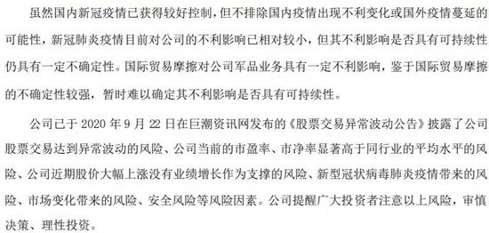 当时公司解释称,“新型冠状病毒肺炎疫情的影响。2020年年初爆发的新型冠状病毒肺炎疫情,影响到公司的科研进度、生产进度以及募投项目的建设进度等,使得公司的科研任务不能按时完成和交付使用,公司部分军品订单不能按时供货,部分民品不能满足库存需求,影响到公司二季度的民品市场。”