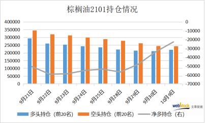 从持仓情况来看,由于国庆长假前资金避险需求强烈,棕榈油2101合约多空双方均大幅减仓,持仓量连续7个交易日减少,自高点累计下降近17万手,市场参与热情极度萎靡。事实上节前的最后两个交易日多头持仓已经趋稳,但空头依然在大幅减仓,致使棕榈油2101合约净多持仓重心不断上移截至上周五已逼近-2万手,刷新2101合约净多持仓的最高值,显示出资金做多情绪的回暖。