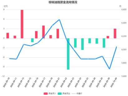 从棕榈油指数的资金流向情况来看,可以发现棕榈油指数的资金流向大体上与收盘价呈现正向关系,即资金流入时期价趋向上涨,反之则趋向下跌。值得注意的是,9月30日虽然棕榈油期价大幅下挫,但是资金却显示为净流入,说明部分资金已经开始提前入场布局。节后回来伴随着棕榈油期价的暴力拉升,资金重新开始大幅流入,市场人气逐步恢复。