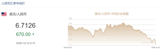 中国货币网数据显示,10月12日,人民币对美元汇率中间价报6.7126元,创2019年4月24日以来新高;较前值调升670点,创2005年7月23日以来最大单日升幅。