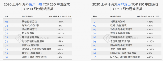 整体来看,报告显示,中国出海移动游戏发行商在大逃杀、MOBA和城战策略游戏上的表现亮眼,偏休闲游戏则有待规模化。2020 上半年海外用户下载前250 名中国游戏中,其他益智游戏、大逃杀类动作游戏、城战策略游戏、超休闲游戏和其他儿童类游戏成为最受欢迎的类别。