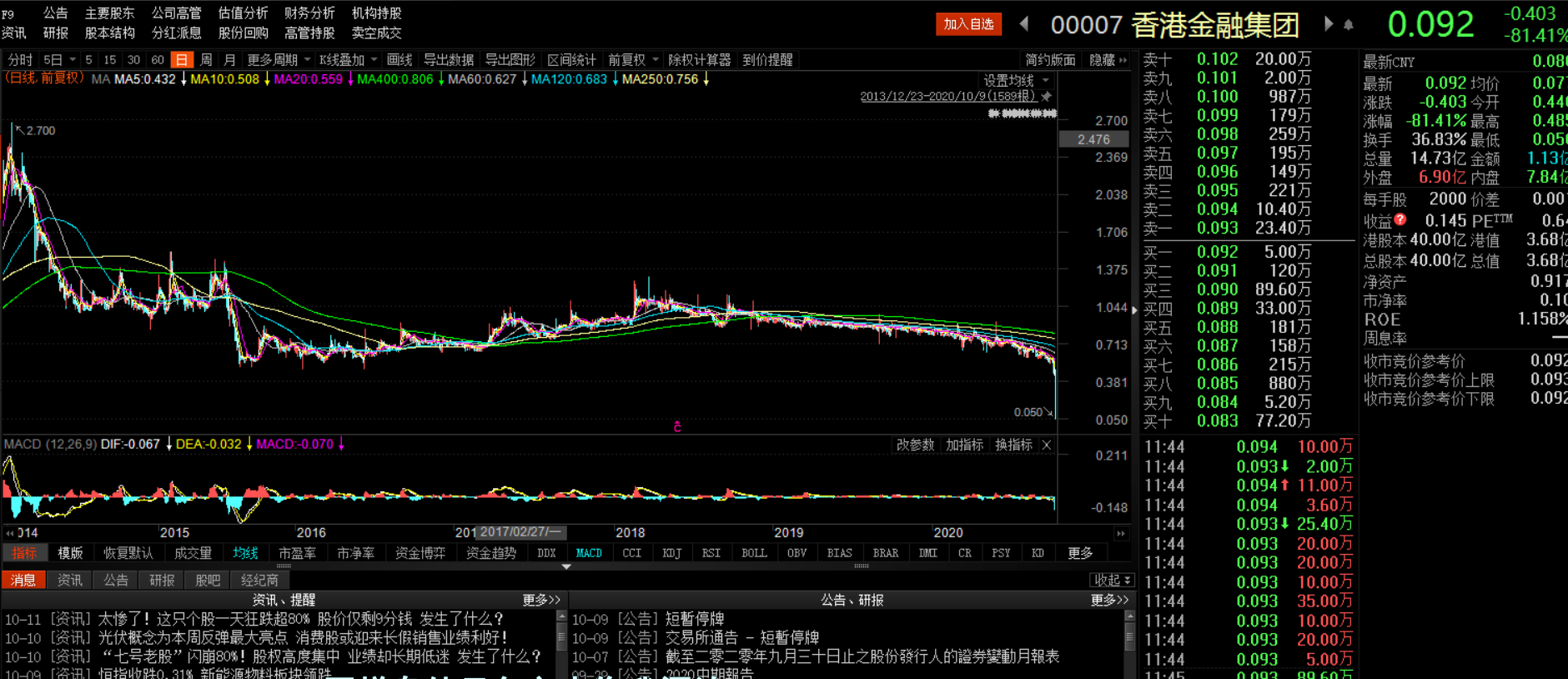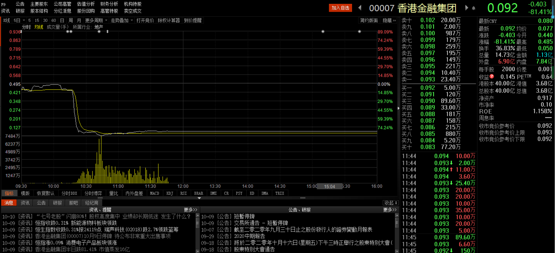 由于公司股票代码为“0007.HK”,因此香港金融集团被香港股民昵称为“七号仔”。但令人惋惜的是,该公司并没有“007”式的神技从而力挽狂澜阻止股价暴跌。眼看股价一泻千里刹不住车,香港金融集团只得在当日上午11时45分起短暂停牌,以待刊发重大出售事项的公布。