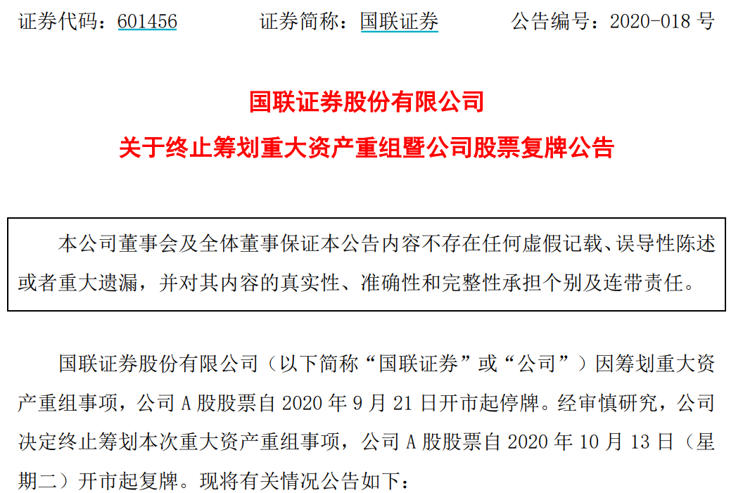 国联证券亦公告称,经审慎研究,公司决定终止筹划本次重大资产重组事项。两家公司股票自10月13日(星期二)开市起复牌。