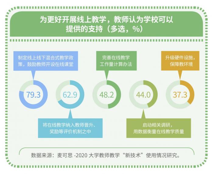 研究显示,接近八成的教师认为,兼顾线上和线下教学特征的混合式教学应当获得学校支持,例如制定线上线下混合式教学政策,鼓励教师在后疫情时代开展在线教学等。