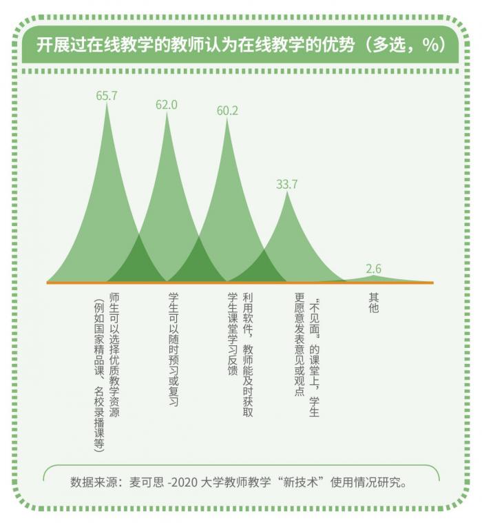 数据显示,超过六成教师认为在线教育的优势在于提供更多可选的课程资源,学生可以灵活安排学习时间,以及教师可以利用软件及时获取学生课堂学习反馈。