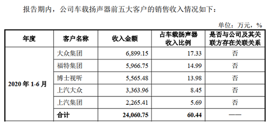 同时,问题9.1关于“不同产品类型主要客户情况”的回复中又披露,2020年上半年,上声电子对大众集团销售车载扬声器形成的销售收入为6899.15万元。这也就意味着,上声电子对大众集团的销售收入中有28.29万元是来自功放和AVAS的销售。