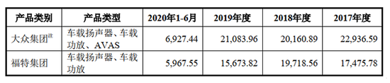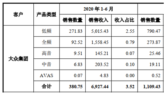首先看对大众集团的销售收入结构。首轮问询问题9.1关于“报告期内主要客户销售产品类型和金额”的回复中显示,2020年上半年,上声电子对大众集团的销售收入为6927.44万元,销售内容包括车载扬声器、车载功放和AVAS。