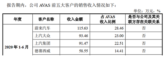 此外,问题9.1关于车载功放前五大客户的信息披露中没有发现上汽大众的身影,但在关于AVAS前五大客户的信息披露中却显示,2020年上半年,上声电子对上汽大众因销售AVAS产生的销售收入为93.46万元,而不是88.15万元。