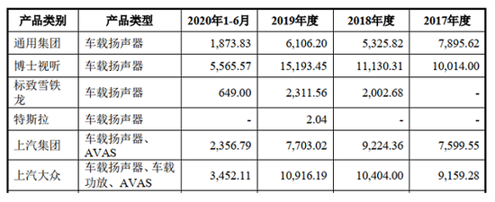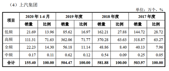 招股说明书及首轮问询回复显示,2017-2020年上半年,上声电子车载扬声器的销售收入分别为12.03亿元、11.78亿元、11.43亿元和3.98亿元,在主营业务收入中的占比分别为99.56%、97.94%、97.64%和96.29%。可见,车载扬声器是上声电子的主要收入来源,但梳理相关数据却发现,上声电子对上汽集团的车载扬声器销量却令人甚是费解。