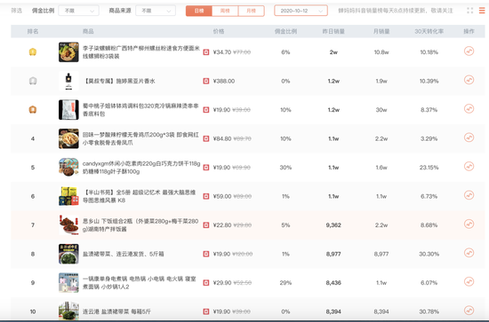 据蝉妈妈数据显示,抖音热销榜前列的商品,多数为50元以下的商品,并且以食品居多,平均客单价与SKU的成熟电商平台相差甚多。
