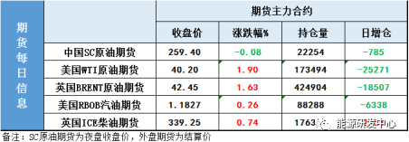 【1】WTI 主力原油期货收涨0.75美元,涨幅1.9%,报40.2美元/桶;布伦特主力原油期货收涨0.68 美元,涨幅1.63%,报42.45美元/桶;INE原油期货收跌0.08%,报259.4元。