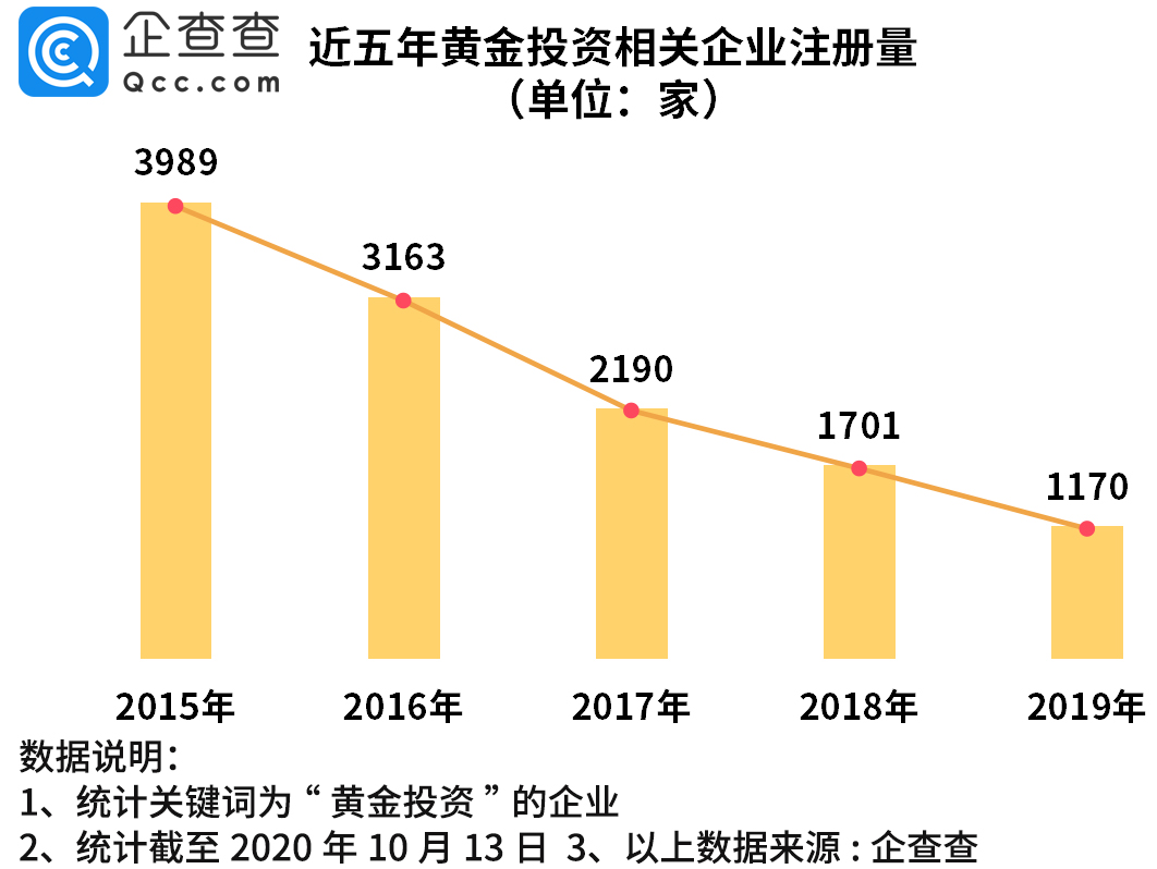 虽然近期黄金市场大起大落趋势明显,但投资黄金是百姓老生常谈的话题,近几年黄金投资市场起伏颇大,相关企业注册量呈现连年下跌趋势。企查查数据显示,2015年相关企业有3989家,至2019年这一数量仅为1170家,较五年前下跌了71%。