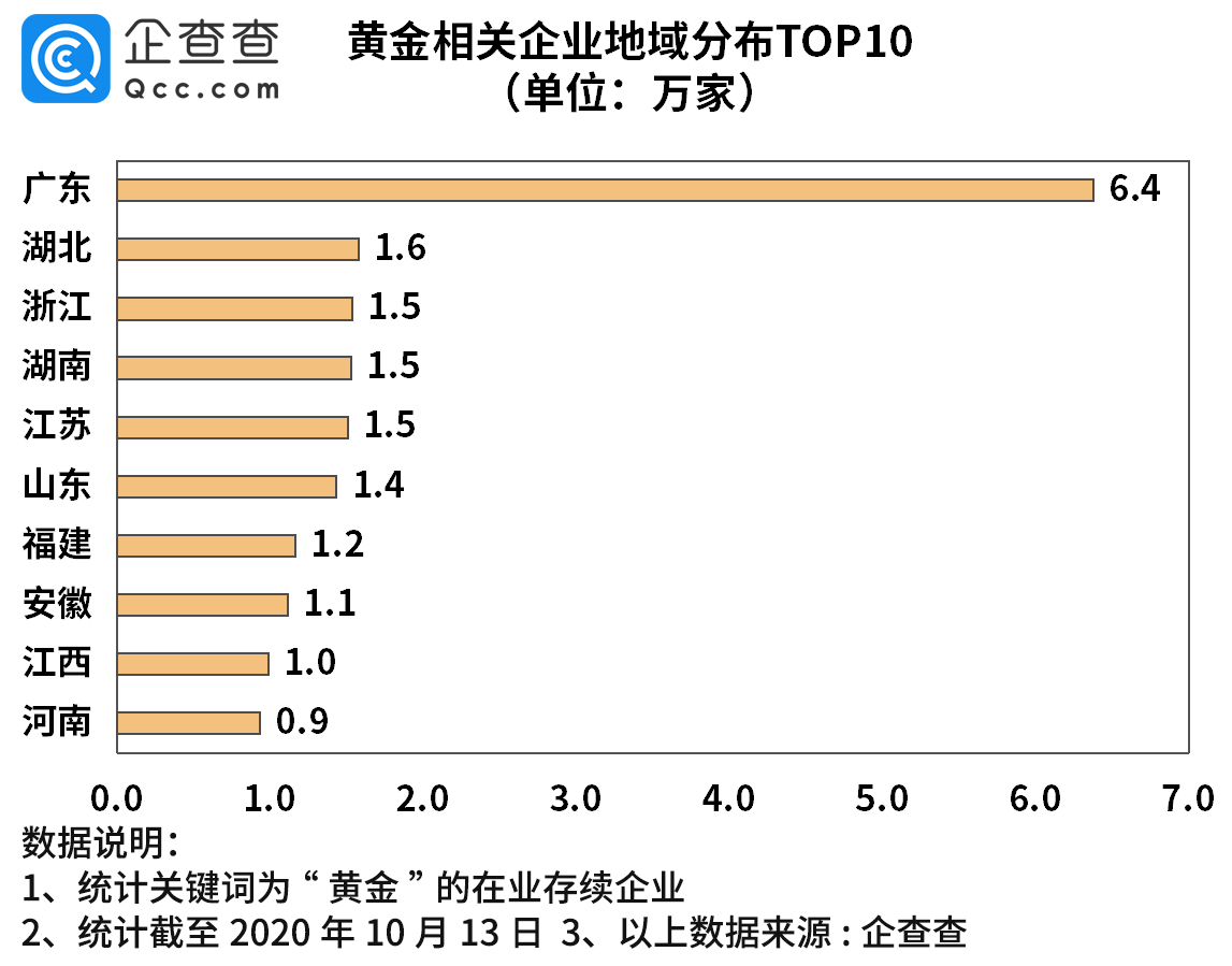 新京报贝壳财经讯 国际金价今年以来经历了大起大落,金价的走势时刻牵动着资本市场的神经。据企查查最新发布的数据显示,黄金相关企业今年前三季度新增2.7万家,其中三季度新增1.03万家,环比下降7.2%。目前,我国共有26.2万家黄金相关企业,近十年来注册量总体呈现上升趋势,2019年新注册4.2万家,同比上升8%。从地区分布来看,广东省以6.4万家企业排名第一,湖北、浙江位列二三名。而在“黄金投资”相关企业的数量排名中,深圳以6千余家企业在一线&新一线城市中高居第一,是第二名广州的4.5倍。