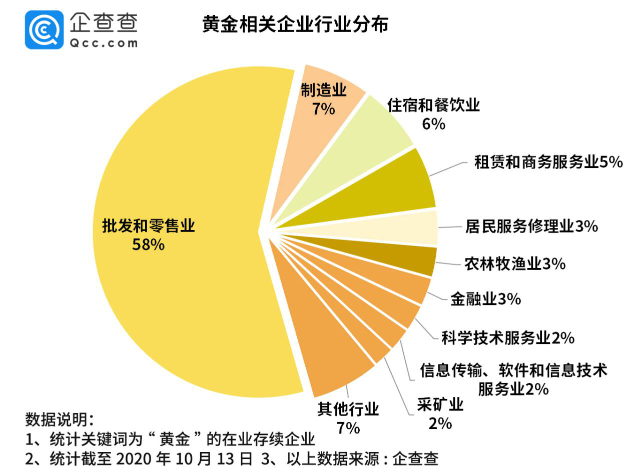 根据目前上海黄金交易所的相关规定来看,我国只有七个黄金生产厂家具备生产鉴定资格,而对于代理金店而言,黄金制品皆属于黄金公司。企查查数据显示,黄金相关企业中分布于批发和零售业的企业最多,共有企业状态为在业/存续的相关行业企业15.2万家,占所有企业总数的58%,制造业以及住宿和餐饮业也较为密集,分别占据7%和6%,而分布于采矿业的相关企业仅有2%。