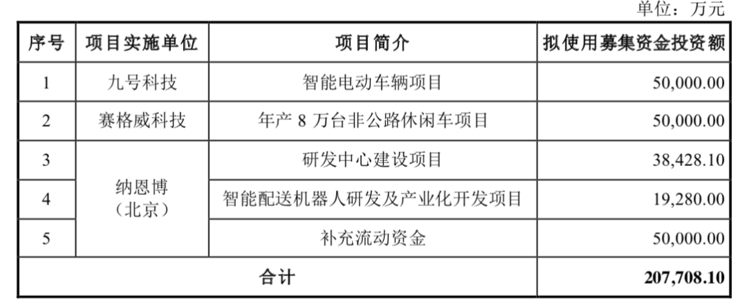 从募资用途来看,九号智能募集资金将用于智能电动车项目、年产8万台非公路休闲车项目、研发中心建设项目、智能配送机器人研发及产业化开发项目,以及补充流动资金。
