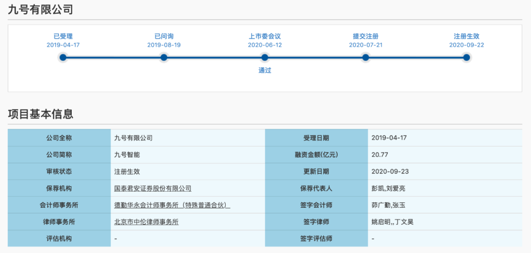 公开资料显示,科创板首单CDR项目九号智能在9月22日拿到证监会注册批文。公司计划融资20.77亿元,保荐机构为国泰君安。