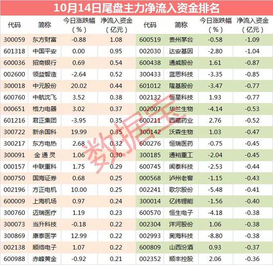 沪指10月14日下跌0.56%,主力资金全天净流出378.95亿元。其中,中小板主力资金净流出80.22亿元,创业板主力资金净流出122.04亿元,沪深300成份股主力资金净流出99.23亿元。