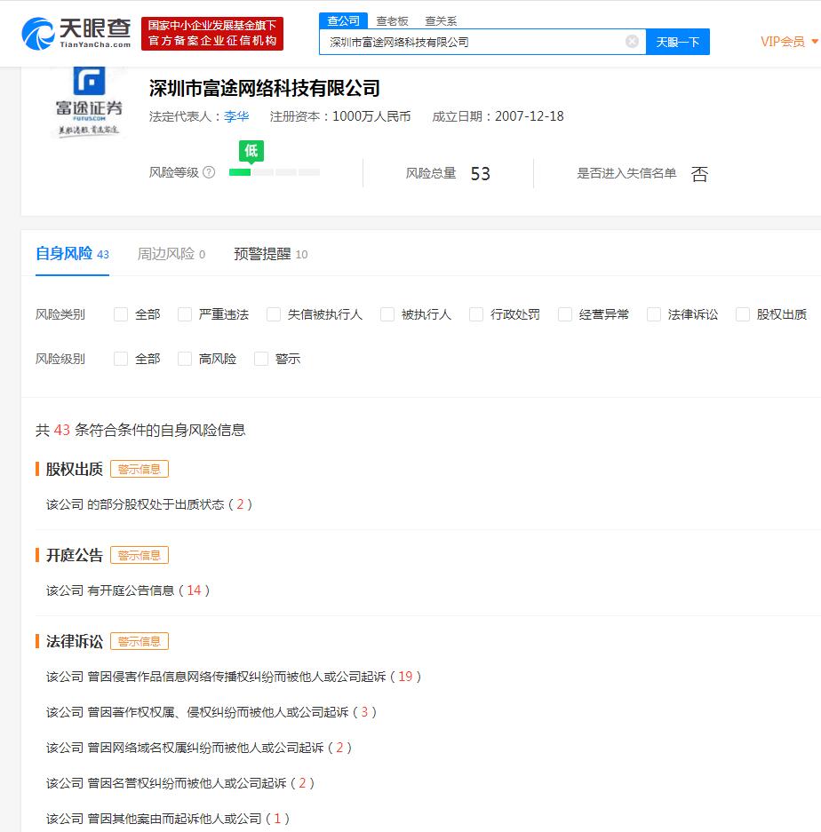 此外,天眼查APP数据显示,深圳市富途网络科技有限公司曾多次因侵害作品信息网络传播权纠纷、著作权权属、侵权纠纷、网络域名权属、名誉权纠纷而被他人或公司起诉。(中新经纬APP)