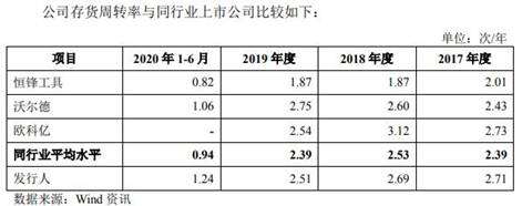 2017年末、2018年末、2019年末、2020年6月末,华锐工具存货账面价值分别为3198.52万元、4825.36万元、5390.74万元、5756.56万元,占流动资产的比例分别为30.89%、34.53%、26.72%、27.79%,存货逐年增加。报告期内,华锐工具存货周转率分别为2.71、2.69、2.51、1.24,同行业上市公司存货周转率平均值分别为2.39、2.53、2.39、0.94。