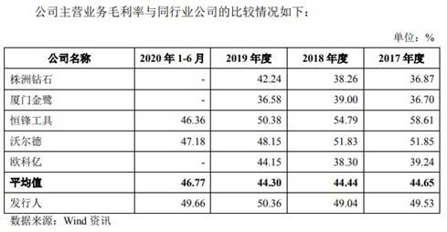 华锐工具表示,行业内主要公司毛利率普遍较高。报告期内,公司主营业务毛利率均处于同行业可比公司毛利率区间内,高于同行业可比公司毛利率平均值但不存在显著差异。