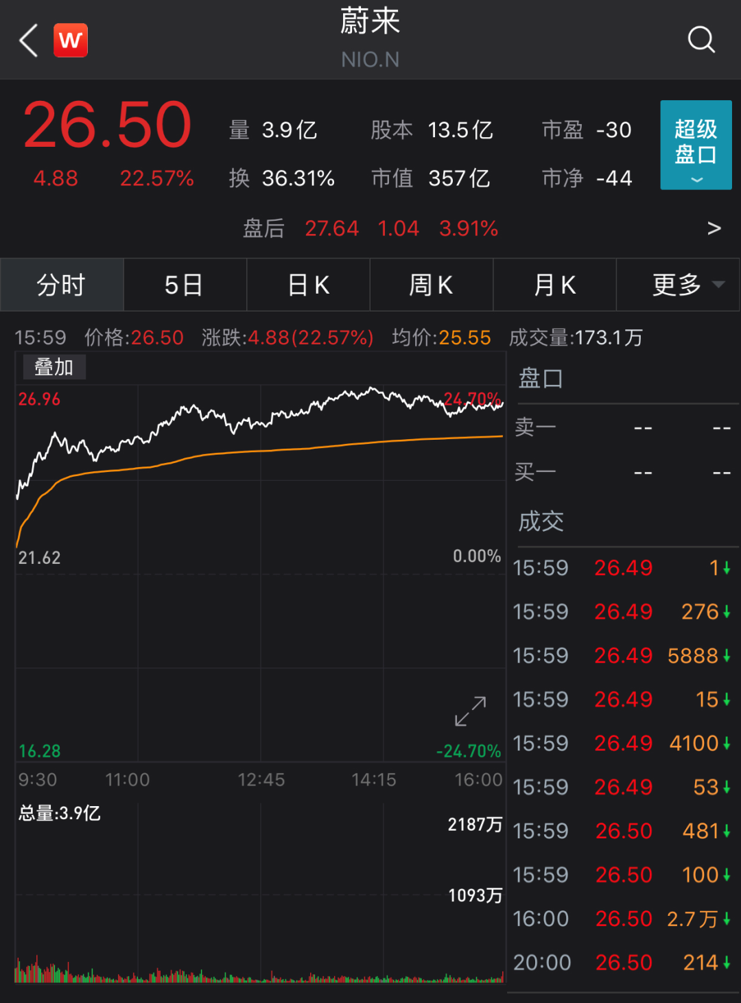 10月14日,在美上市的电动汽车制造商蔚来汽车股价飙升22.57%,收报26.50美元,创下新高,公司市值达357.46亿美元。
