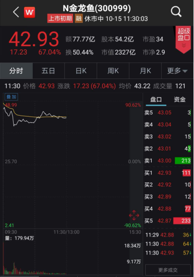 个股方面,有着“油中茅台”之称的金龙鱼今日登陆创业板,高开90.51%。截至午间收盘,报42.93元/股,大涨67%,总市值为2327亿元,已经超过洋河股份和三一重工,位居A股第46位。在创业板内,其市值也仅次于宁德时代、迈瑞医疗、智飞生物和爱尔眼科,位居第5位。