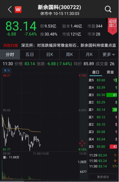此前上涨的热门股纷纷大跌。以新余国科为例,该公司在前一交易日涨停,但在14日上午盘中一度跌近7%。截至午盘,该股报83.14元/股,成交额9.53亿元,换手率30.48%。