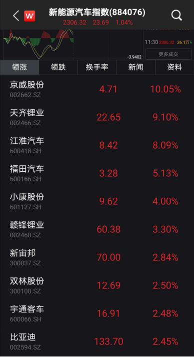 新能源汽车板块继续上涨。截至午盘,京威股份涨停,天齐锂业、江淮汽车、福田汽车、小康股份、双林股份等纷纷走高。