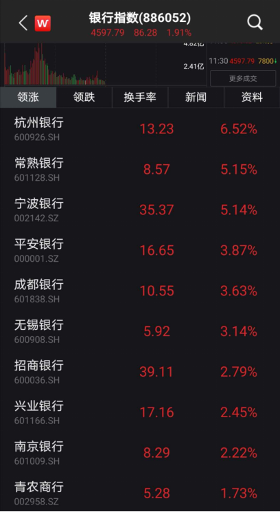银行板块迎来上涨,申万银行指数半日上涨2.01%,杭州银行、常熟银行、宁波银行等涨幅超过5%。