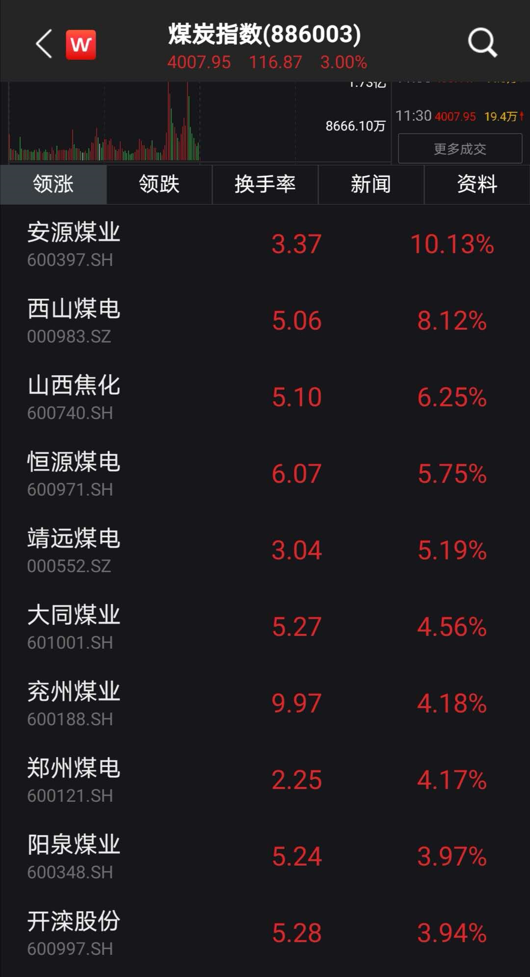煤炭板块中,安源煤业午盘涨停,西山煤电、山西焦化、恒源煤电、靖远煤电等涨幅超5%。