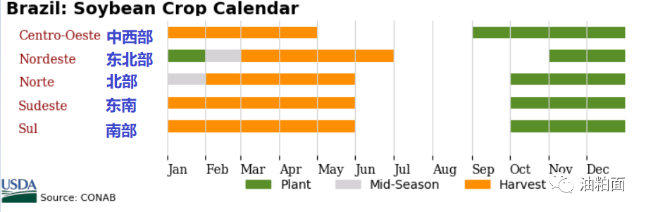 由于巴西地处热带气候区且作物具有长生长期,在巴西农作物生产周期比美国传统作物周期更为复杂。下面是巴西农作物生长季节中逐月的情况以及每个月可能出现的典型天气状况。