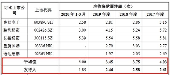 同期,英力电子应收账款周转率(次)分别为2.61、2.58、2.46、1.85;可比上市公司应收账款周转率平均值分别为4.03、3.75、3.45、3.66。