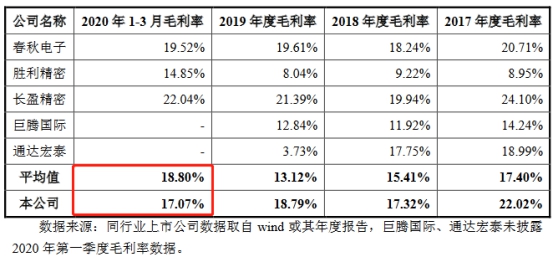 2017年至2020年1-3月,英力电子综合毛利率分别为22.02%、17.32%、18.79%和17.07%,呈现一定程度波动向下的趋势。而同期,同行业上市公司综合毛利率均值分别为17.40%、15.41%、13.12%、18.80%。