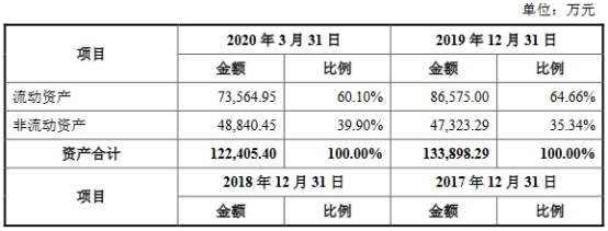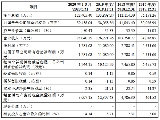 2017年末、2018年末、2019年末、2020年3月末,英力电子资产总额分别为7.62亿元、11.21亿元、13.39亿元、12.24亿元;负债合计4.61亿元、7.03亿元、7.58亿元、6.30亿元。报告期内,公司资产负债率(母公司)分别为45.03%、52.50%、54.33%、50.43%。