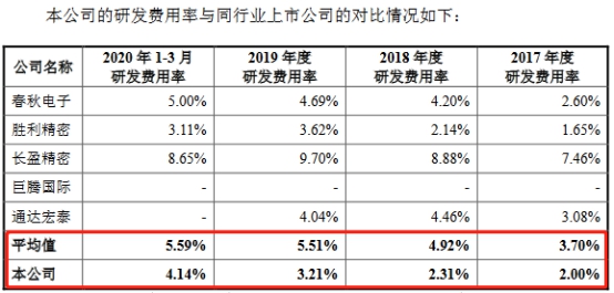 此外,英力电子研发费用率连续三年一期低于可比公司均值。2017年度、2018年度和2019年度及2020年1-3月,英力电子研发费率分别为2.00%、2.31%、3.21%、4.14%;同行业上市公司研发费用率平均值分别为3.70%、4.92%、5.51%、5.59%。