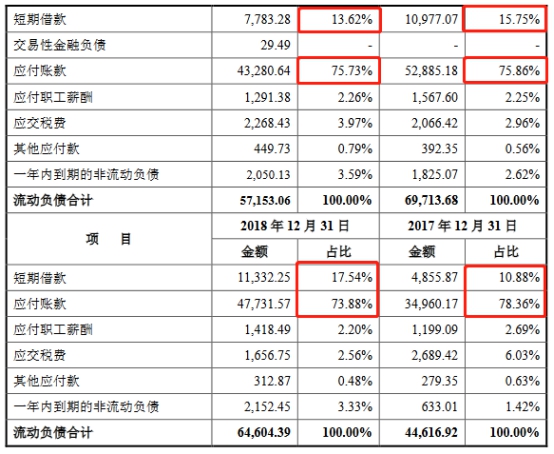 英力电子流动负债主要由短期借款与应付账款构成,报告期各期末上述两项合计占公司流动负债的比例超过85%。
