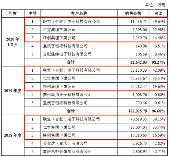 招股书显示,联宝对英力电子业绩快速增长贡献率最大。2017年至2020年1-3月,联宝均是英力电子第一大客户,相关销售金额分别为2.89亿元、4.06亿元、5.31亿元、1.14亿元,占总销售额的比例分别为39.03%、39.15%、42.09%、49.64%,逐年增长。