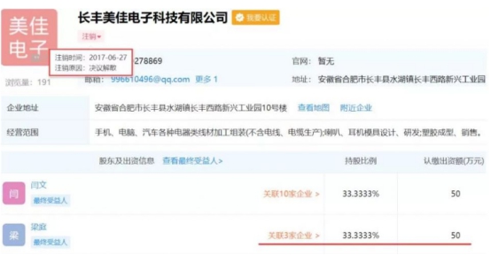 工商资料显示,美佳电子从事手机、电脑、汽车各种电器类线材加工组装(不含电线、电缆生产);喇叭、耳机模具设计、研发;塑胶成型、销售,与英力电子业务高度类似,该司于2017年6月27日注销。