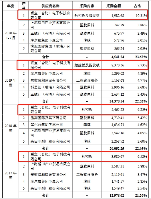 值得注意的是,报告期内,联宝既是英力电子第一大客户也是第大一供应商。2017年度至2020年1-3月,英力电子向联宝采购的金额分别为3980.67万元、5465.23万元、8370.56万元和1982.68万元,占总采购额的比例分别为6.52%、6.25%、7.73%和10.31%。