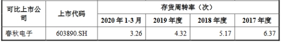 而同期,英力电子的存货周转率呈持续下滑趋势。2017年度、2018年度、2019年度及2020年1-3月,公司存货周转率分别为5.69、5.42、5.11、3.42。