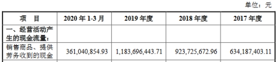 2017年至2020年1-3月,英力电子营业收入分别为7.40亿元、10.38亿元、12.62亿元、2.30亿元;销售商品、提供劳务收到的现金分别为6.34亿元、9.24亿元、11.84亿元、3.61亿元。