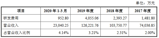 2017年度、2018年度和2019年度及2020年1-3月,英力电子研发费用金额分别为1481.80万元、2393.27万元、4055.06万元和952.80万元,占营业收入比例分别为2.00%、2.31%、3.21%、4.14%。