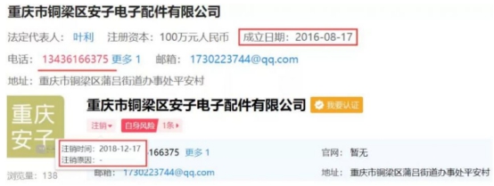 工商资料显示,叶利曾于2016年8月17日成立重庆市铜梁区安子电子配件有限公司,该司经营范围包含英力电子上下游业务,2018年12月17日注销。
