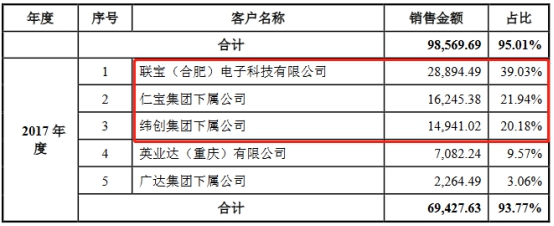 其中,联宝(合肥)电子科技有限公司(简称“联宝”)、仁宝集团下属公司(简称“仁宝”)、纬创集团下属公司(简称“纬创”)连续三年一期为英力电子前三大客户。
