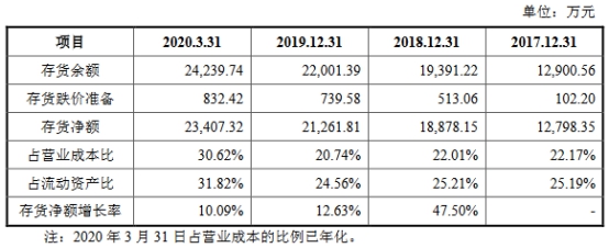 2017年12月31日、2018年12月31日、2019年12月31日及2020年3月31日,英力电子存货期末账面价值分别为1.28亿元、1.89亿元、2.13亿元和2.34亿元;占当期末流动资产的比例分别为25.19%、25.21%、24.56%和31.82%;占当期营业成本的比例分别为22.17%、22.01%、20.74%和30.62%。
