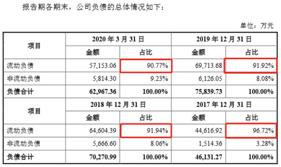 英力电子三年一期流动负债占负债总额的比例超9成。2017年12月31日、2018年12月31日、2019年12月31日及2020年3月31日,英力电子流动负债分别为4.46亿元、6.46亿元、6.97亿元、5.72亿元,占负债总额的比例分别为96.72%、91.94%、91.92%和90.77%。