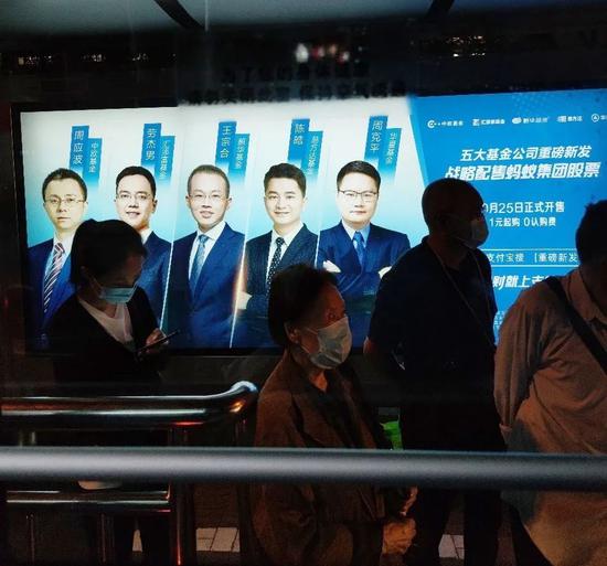 此外,在创新未来基金销售期间,广告频频轰炸。五名来自不同公司的基金经理出现在同一画面,在街边路口、通勤公交、户外显示屏、机场大屏、社交媒体首页,随处可见,力争让基金“出圈”。