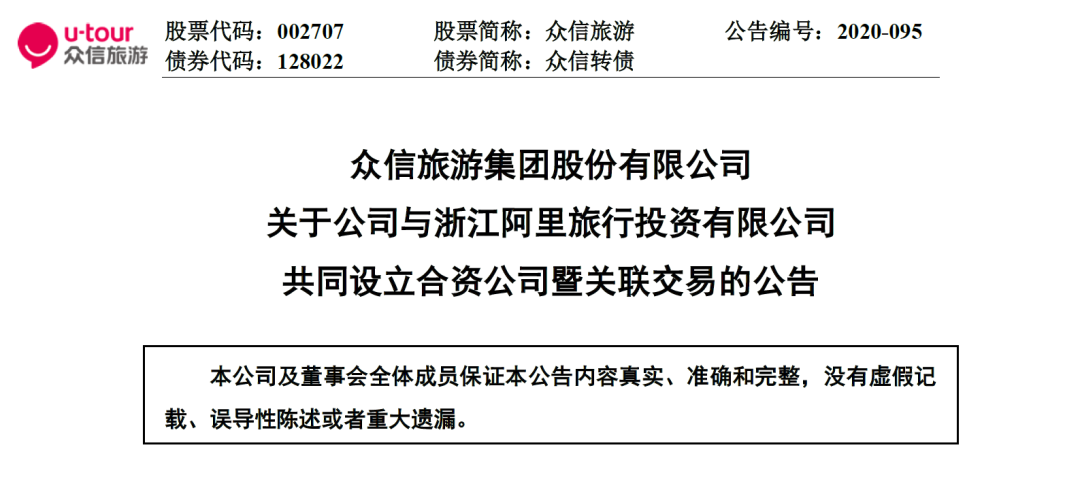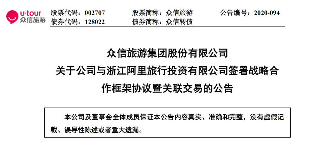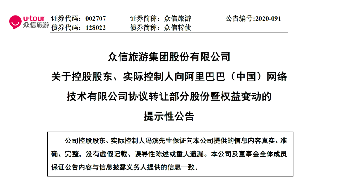 2020年9月29日,众信旅游控股股东、实际控制人冯滨先生与阿里网络签署了《股份转让协议》,冯滨以人民币8.46元/股的价格向阿里网络转让其持有的众信旅游45,470,295股无限售条件流通股,约占股份转让协议签署日众信旅游总股本的5%,股份转让价款总额为约人民币3.85亿元。