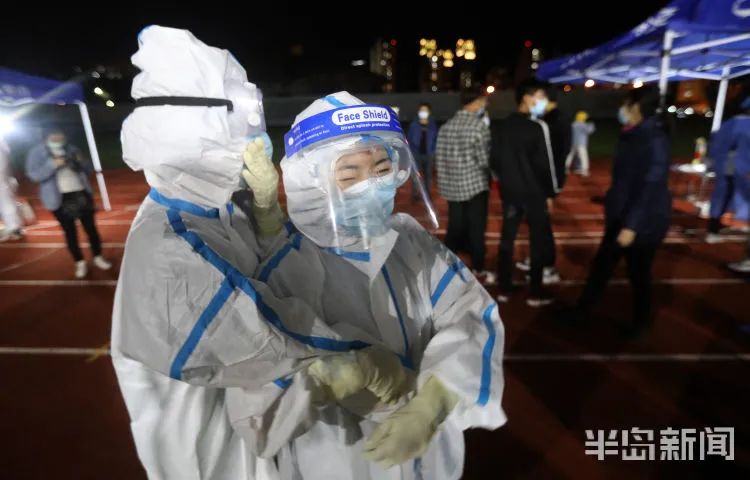 10月13日晚10时许,青岛大学西院操场上,医疗人员经过一天的奋战,终于全部检测完了大学内四万余名师生,工作人员开心地拥抱在一起